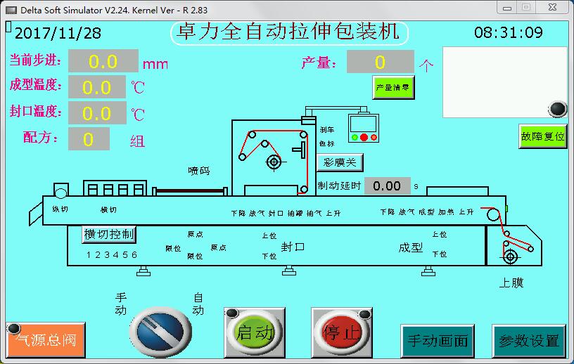 ——在顯示的日期下方依次顯示當(dāng)前步進(jìn)、成型溫度、封口溫度、配方等信息,當(dāng)包裝機(jī)供電后,如果“手動(dòng)畫面”中的“加熱開關(guān)”在開的位置,包裝機(jī)將自動(dòng)根據(jù)所設(shè)定的溫度自動(dòng)加溫并控溫。配方是噴碼機(jī)構(gòu)噴碼的依據(jù),在“參數(shù)設(shè)置”中設(shè)定。